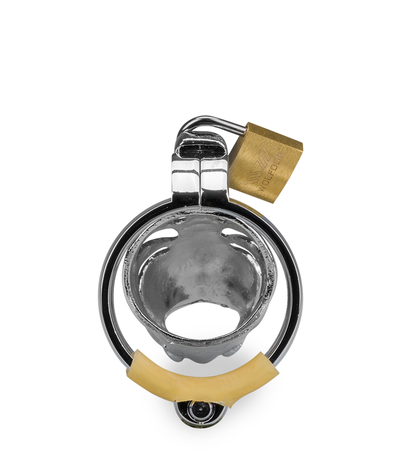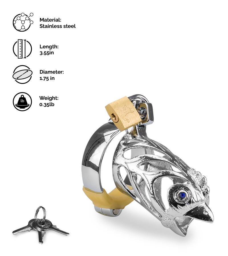 The chastity cage is 3.55 inches long and the holding ring has a 1.75-inch diameter. It comes with a padlock and a set of 3 keys.