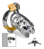The Tiger Chinese zodiac penis chastity cage has a total length of 3.25 inches. Its holding ring has a 1.75-inch diameter. It comes with a padlock and 3 keys.