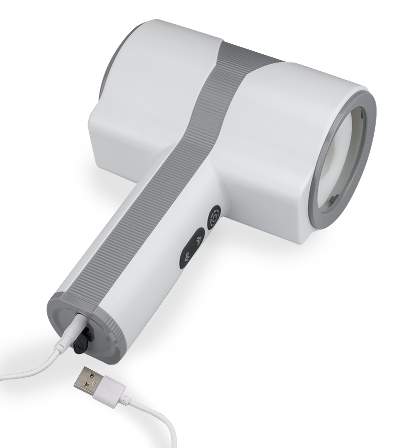 The Double Game masturbator is 8.50 inches long (from the bottom of the handle to the top) and 5.75 inches wide (from one opening to the other). The internal length is 5.50 inches, and the internal diameter is 1.50 inches. A USB charging cable is included.