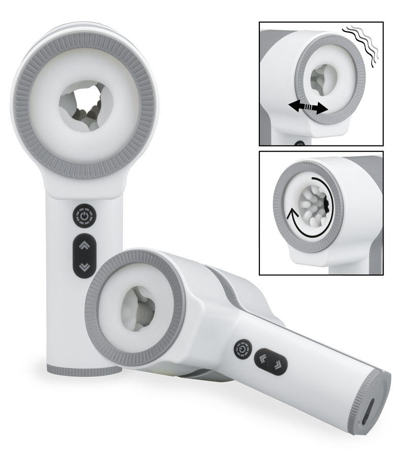 This male sex toy offers a wide range of sensations for powerful orgasms. Depending on which end you choose, the tunnel with two automatic silicone sleeves will stimulate you in a different way. One end has a rotating sleeve with pleasure nubs, and the other end has a ribbed sleeve with thrusting and vibrating movements. You may customise your experience with 7 vibration modes, 5 rotation modes, and 5 thrusting modes. Plus, the handle allows you to grasp it securely in your hand to take full advantage of the experience!