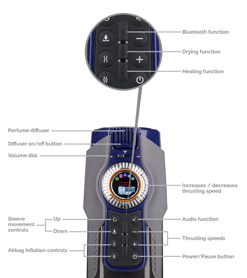 9. The button above the airbag buttons will lower the sleeve into the masturbator tunnel. The button above the airbag buttons moves the sleeve up into the masturbator tunnel. These buttons can only be used when the thrusting is stopped.
