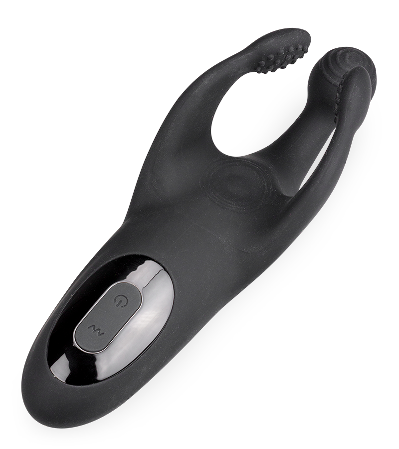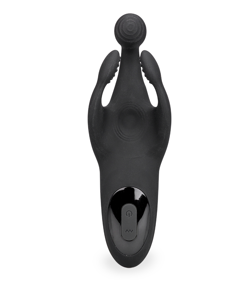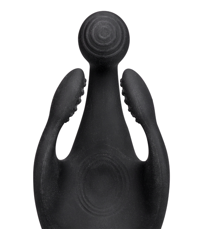 Made of soft silicone, this male sex toy offers you a whole new way to enjoy solo play. It has three soft, flexible arms, one of which vibrates (the middle arm) and two of which are textured (small pleasure nubs) to stimulate the whole length of your penis. Between the two textured arms, there's also a throbbing area that will massage the tip of your penis in an intense way.