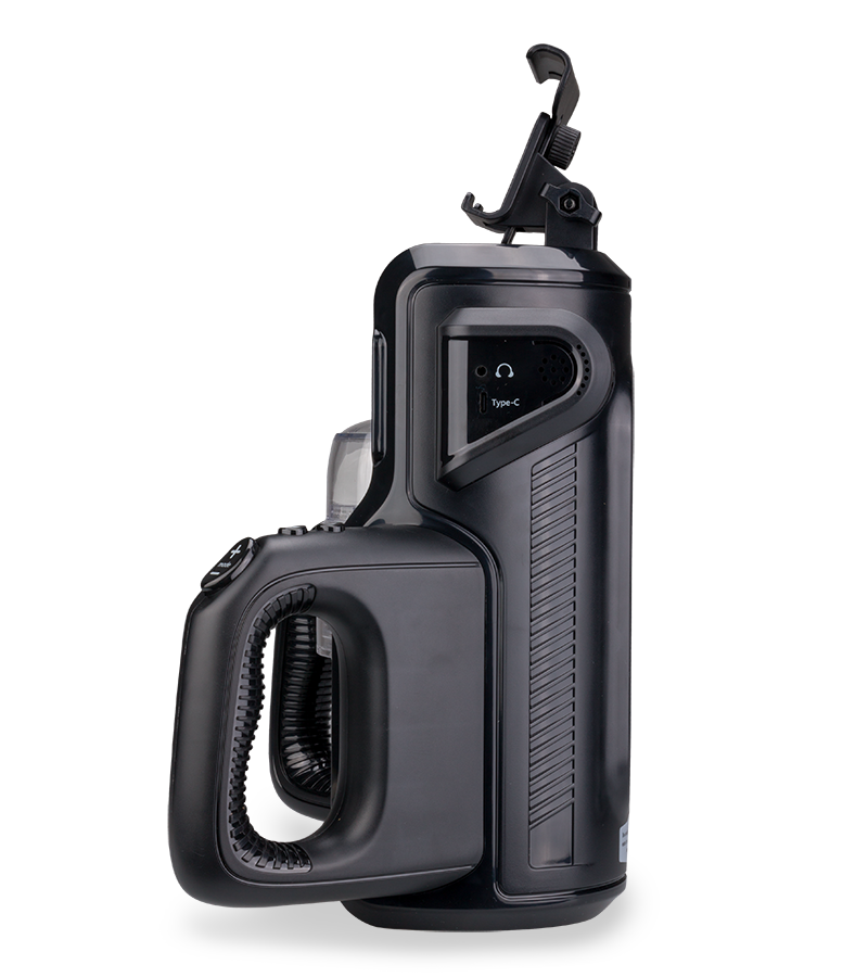 This masturbator is 10.50 inches long (without the phone holder) and 10.50 inches wide (from handle to handle). The open neutral sleeve is 4.25 inches long. The closed vagina sleeve is 5.00 inches long and 4.75 inches deep. The diameter of the two sleeves is 1.50 inches. A USB type-cable is included to easily recharge the battery.