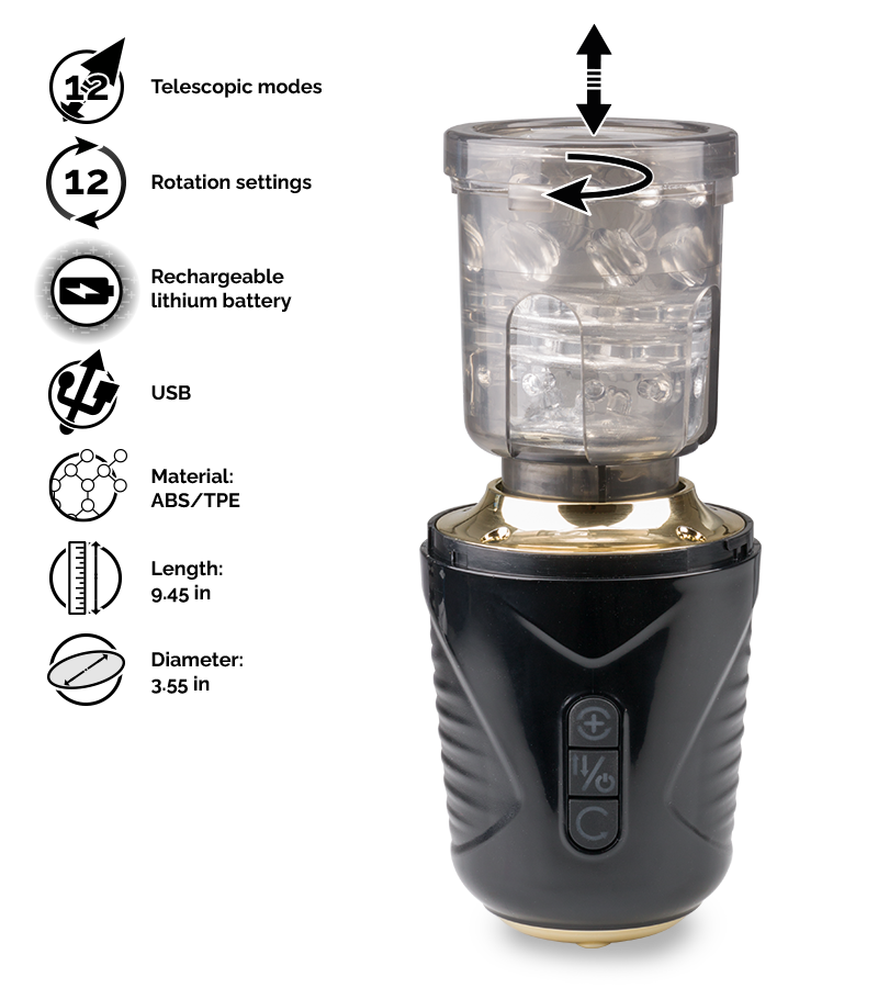 This masturbator, made for men looking for highly stimulating experiences, delivers intense massages for powerful orgasms. The textured, bumpy sleeve will go performs thrusting and rotating movements on your member at the perfect rhythm for you. With 14 stimulation modes that can be controlled with a single click, you'll have a different experience every time that you use this toy.